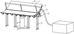 1.一种抛物镜聚焦太阳能光热采暖装置,其特征在于:包括底座(1)、间隔设置在底座(1)上方的支撑块(2)、多个固设在支撑块(2)下方的支腿(3)、转动连接在支撑块(2)上的架体(4)、设置在架体(4)上的抛物镜(6)、设置在抛物镜(6)凹面一侧的采暖装置本体(7)、设置在支撑块(2)与底座(1)之间用于控制支撑块(2)沿竖直轴线转动以及控制支撑块(2)上下升降的旋转升降机构(8)、设置在支撑块(2)与架体(4)之间用于控制架体(4)沿水平轴线转动的竖直旋转机构(5)。