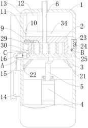 所述压力机构包括第二活塞缸(16),所述第二活塞缸(16)插设在外壳(1)的一侧,所述第二活塞缸(16)内滑动插设有第二活塞(32),所述第二活塞(32)内开设有通风口(19),所述通风口(19)内转动连接有挡板(18),所述第二活塞(32)的右侧固定连接有连杆(17),所述连杆(17)的右侧固定连接有接触板(20),所述接触板(20)与动涡盘(3)相触,所述第二活塞(32)和第二活塞缸(16)的右侧内壁之间安装有弹簧(33),所述第二活塞缸(16)的左侧插设有第三管道(15),所述第三管道(15)上设置有第二单向阀,所述第三管道(15)的底端插设在回收箱(14)上。