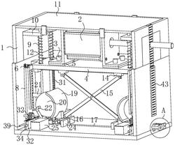 1.一种新能源汽车电机减震装置,包括箱体(1),其特征在于:所述箱体(1)内上端设有电机(2),所述电机(2)固定设在滑动板(4)上,所述滑动板(4)滑动在设在所述箱体(1)内左右两侧所开设的第五滑槽(45)内,所述滑动板(4)左右两侧前后对称固定设有用于电机(2)左右两侧端减震的第一弹簧(6),所述第一弹簧(6)均通过第一滑块(7)与所述箱体(1)的第一滑槽(8 )滑动连接;所述滑动板(4)上端面四周对称固定设有第一滑杆(9),所述第一滑杆(9)均滑动设在固定在所述箱体(1)内的第一支撑板(10)上,所述第一滑杆(9)上端面接触所述箱体(1)的上顶板(11),所述上顶板(11)滑动设在箱体(1)上端,所述第一滑杆(9)上还套接设有用于电机(2)纵向方向减震的第二弹簧(12),且所述第二弹簧(12)位于滑动板(4)上端面和第一支撑板(10)下端面;所述滑动板(4)下端面固定设有第一连接杆(13),所述第一连接杆(13)上左右对称滑动设有第二滑块(14),所述第二滑块(14)上铰接设有连板(15),两个所述连板(15)中心交叉程X形设置,所述连板(15)底端铰接设有第三滑块(16),所述第三滑块(16)滑动设在所述箱体(1)内底板上所开设的第二滑槽(17)内,所述第三滑块(16)向所述箱体(1)外侧左右方向的端部固定设有用于电机(2)纵向方向减震的第三弹簧(18),所述第三弹簧(18)的另一端固定设在第四滑块(47)上,所述第四滑块(47)滑动设在箱体(1)左右侧壁上;所述第三滑块(16)上固定设有弧形推板(19),所述弧形推板(19)对应的所述箱体(1)外侧左右方向设有气囊(20),所述气囊(20)上端设有进气管(21),且所述进气管(21)贯穿固定设在箱体(1)上,所述气囊(20)前后两侧端均对称固定设有出气管(22),所述出气管(22)下端固定设有多个气喷头(23),且所述多个气喷头(23)对着所述第三弹簧(18)。