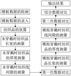 S7、第一次数据对比,当未穿戴时纺织品的各项数据检测完毕之后,将步骤S3中检测得到的长宽数据、步骤S4中检测得到的厚度数据、步骤S5中检测得到的纺织线检修数据传导到计算机的对比模块中,将待检测纺织品的各项数据与合格纺织品的各项数据进行对比,得出对比结果;