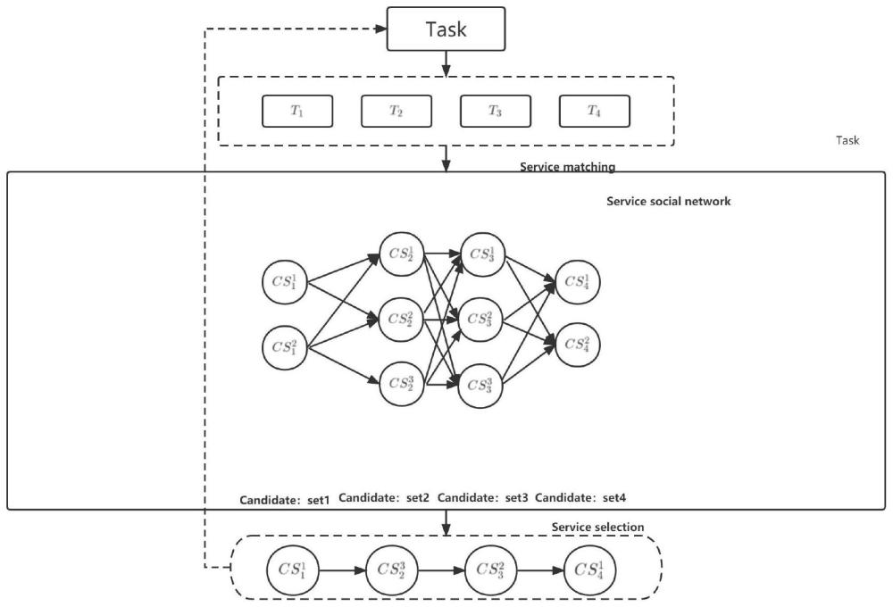 步骤3:子任务Ti从候选服务集中选择符合任务要求的服务 最终选择出服务总要求的服务链,选出的服务链可表示为:步骤4:假设子任务Ti有m个候选服务 理论上,完成任务T有 条符合要求的服务链,其中,m为对应工序的子任务,I为子任务的数量,i=1,2,...,I,选择服务链的过程中根据任务要求考虑若干QoS指标约束,根据各种指标的约束不断调整选择的服务和计算服务间的协同度,最终确保所选择的服务链在满足所有任务要求,即,在所有可能的组合路径中选择一个最优的组合路径;