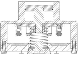 1.一种环形阵列式预压可调的压电俘能器,其特征在于:外壳体、盖板、壳体螺栓、下端盖、导线、盖板螺栓、螺母、压电俘能组件、俘能控制组件和预压可调装置,其中,压电俘能组件包括上内衬、下内衬、压电陶瓷片和弹性缓冲块;俘能控制组件包括活塞、主推杆、O型圈、格莱圈、花键、上推盘、触头螺栓、弹性触头和触头推杆;预压可调装置包括弹簧、下推盘、预紧座和预紧旋钮;外壳体为圆柱形壳体,其内部包含压力空腔和压电空腔,压力空腔侧外部为外螺纹,用于连接外部管道系统;在压电俘能组件中,上内衬和下内衬把压电陶瓷片包围在其中,弹性缓冲块放置在压电陶瓷片的下方;俘能控制组件中的活塞放置于外壳体的压力空腔内,并用O型圈和格莱圈进行密封,上推盘、弹性触头和触头推杆放置于外壳体的压电空腔中,其中上推盘为圆盘形状,中间开有圆柱形固定孔,边缘阵列六个沉头孔口用于放置触头螺栓固定触头推杆,弹性触头为软材质,放置在触头推杆上,触头推杆的触头端圆柱形槽内设有半圆形防滑凸起,活塞和上推盘通过主推杆连接,花键置于外壳体和主推杆之间防止主推杆进行转动;预压可调装置中各元件的放置顺序自上而下依次为弹簧、下推盘、预紧旋钮和预紧座,下推盘和预紧旋钮之间为螺纹连接,预紧旋钮与预紧座之间通过预紧旋钮限位面和预紧限位槽槽面发生面接触。