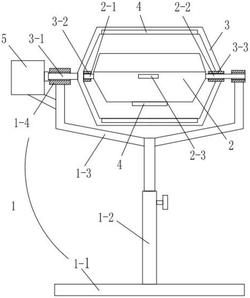 2.根据权利要求1所述的一种儿科黄疸照射箱,其特征在于,所述支撑架(1)包括,底座(1‑1),所述底座(1‑1)中部竖直设置有伸缩调节杆(1‑2),所述伸缩调节杆(1‑2)的顶部对称设置有两个支撑臂(1‑3),所述支撑臂(1‑3)的顶端横向设置有第一轴套(1‑4),所述灯架(3)的左端外侧横向设置有第一转轴(3‑1),所述第一转轴(3‑1)在所述第一轴套(1‑4)内转动,左侧所述支撑臂(1‑3)上固定设置有转动电机(5),所述转动电机(5)的输出端与所述第一转轴(3‑1)相连接,所述灯架(3)的左端内侧横向设置有第二轴套(3‑2),所述灯架(3)的右端横向贯穿设置有第三轴套(3‑3),所述箱体(2)的左右两端分别设置有第二转轴(2‑1)和第三转轴(2‑2),所述第二转轴(2‑1)在所述第二轴套(3‑2)内转动,所述第三转轴(2‑2)穿过所述第三轴套(3‑3)在右侧的所述第一轴套(1‑4)内转动。