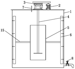 1.一种铝土矿浮选原矿浆预处理装置,其特征在于,槽体(1)为顶部开口处设有顶板的筒状结构,槽体(1)的顶板上设有电机(2)和减速机(3),电机(2)和减速机(3)相连接,减速机(3)和伸进槽体(1)内的搅拌轴(4)的上端连接,搅拌轴(4)的下端有搅拌扇叶,电机(2)、减速机(3)和搅拌轴(4)构成搅拌机构,搅拌轴(4)外周的槽体(1)内设有将搅拌扇叶包围在内的中心套筒(5),槽体(1)内侧壁上对称设置有两个涡流挡板(6),涡流挡板(6)与中心套筒(5)之间有间距,槽体(1)侧壁上部设有贯穿槽体内外壁的溢流口,溢流口外周的槽体(1)外侧壁上有与溢流口相连通的溢流箱(9),溢流箱(9)内部在靠近溢流口的位置竖直设有闸门(14),溢流箱(9)内设有U形的第一卡槽(10)和第二卡槽(12),第一卡槽(10)和第二卡槽(12)内均卡装有与闸门相互平行的第一筛网(11)和第二筛网(13),第一筛网(11)和第二筛网(13)均位于闸门(14)和远离溢流口的溢流箱(9)侧壁之间的溢流箱(9)内,槽体(1)的顶板上设有向下伸进槽体(1)内的捕收剂的添加管(7)和至少两个溢流进料管(16),槽体(1)的一侧底部设有位于涡流挡板(6)下方的放料口,放料口上设有放料阀(8)。2.根据权利要求1所述的铝土矿浮选原矿浆预处理装置,其特征在于,所述的溢流口至少有2个,溢流箱(9)的数量和溢流口的数量相同,第一筛网(11)靠近远离溢流口的溢流箱(9)内侧壁,第一筛网(11)和远离溢流口的溢流箱(9)内侧壁之间的溢流箱(9)侧壁下部有排出口(17);所述的溢流口位于涡流挡板(6)的上端上方的槽体(1)侧壁上。3.根据权利要求1所述的铝土矿浮选原矿浆预处理装置,其特征在于,所述的槽体(1)为钢制成的直径4000 mm、高度4500mm、壁厚6mm的圆筒;所述的中心套筒(5)为钢制成的直径1200mm、高度2700mm、壁厚6mm的上、下两端均开口的管状体,中心套筒(5)位于槽体(1)中部,且和搅拌轴为同心结构,中心套筒的下端距离槽体的内底面500‑1000mm;所述的涡流挡板(6)为长度250mm、高度3700mm的长条形板体,涡流挡板长度方向的边垂直于槽体的侧壁,涡流挡板的下端槽体的内底面200‑500mm。4.根据权利要求1所述的铝土矿浮选原矿浆预处理装置,其特征在于,所述的溢流箱(9)为长90mm、宽50mm、高90mm的长方形箱体。5.根据权利要求1所述的铝土矿浮选原矿浆预处理装置,其特征在于,所述的第一卡槽(10)和第二卡槽(12)的结构形状相同,第一筛网(11)和第二筛网(13)的结构形状相同,第一筛网(11)和第二筛网(13)的筛孔均为5mm。6.根据权利要求1所述的铝土矿浮选原矿浆预处理装置,其特征在于,所述的中心套筒(5)的外侧壁上沿周向环形阵列有多个水平设置的钢管(15),钢管的另一端焊接在槽体(1)的内侧壁上;所述的中心套筒(5)的下端低于搅拌扇叶的底部。7.根据权利要求1所述的铝土矿浮选原矿浆预处理装置,其特征在于,所述的捕收剂的添加管(7)和溢流进料管(16)的出口均与下方的中心套筒(5)上下相对应。8.根据权利要求1所述的铝土矿浮选原矿浆预处理装置,其特征在于,所述的溢流进料管(16)的进口与水力旋流器的溢流出口相连通。9.根据权利要求1所述的铝土矿浮选原矿浆预处理装置,其特征在于,所述的搅拌机构的转速为150r/min。10.根据权利要求1所述的铝土矿浮选原矿浆预处理装置,其特征在于,所述的闸门(14)为插板式闸门。