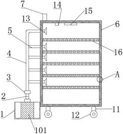 1.一种防火档案存储柜,包括储存柜(6)和柜门(8),所述储存柜(6)的前侧铰接柜门(8),其特征在于:所述储存柜(6)内壁固定连接若干等距离上下分布的隔板(16),所述储存柜(6)的侧面固定连接放置槽(1),所述放置槽(1)内安装若干等距离分布的干粉瓶(101),所述干粉瓶(101)的顶面安装第一分流管(2),所述第一分流管(2)的顶面固定连接气阀(3),所述气阀(3)的顶面固定连接喷管(4),所述喷管(4)的末端贯穿所述储存柜(6)的侧面并延伸至柜内,所述喷管(4)的侧面固定连接若干等距离分布的第二分流管(5),所述第二分流管(5)贯穿所述储存柜(6)的侧面并延伸至柜内,所述喷管(4)的末端与所述第二分流管(5)的末端均固定连接喷嘴(13),所述喷嘴(13)分布在所述隔板(16)之间,所述储存柜(6)的内壁设有防火布(18)。
