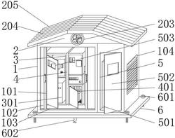 1.一种安全性高的新型箱式变电站,包括装置箱(1)、散热箱(2)、控制柜(3)、进线箱(4)、变电箱(5)和安装底座(6),其特征在于:所述安装底座(6)的顶部固定安装有装置箱(1),且安装底座(6)的顶部连通安装有互为配合使用的固定螺栓(601),所述装置箱(1)的正面设置有互为配合使用的滑道门板(101),且滑道门板(101)与装置箱(1)的内测连接安装有互为配合使用的安装门(102),所述装置箱(1)的底部固定安装有控制柜(3)、进线箱(4)和变电箱(5),且装置箱(1)的顶部固定连接有互为配合使用的散热箱(2),所述控制柜(3)的底部固定安装有万能断路器(301),且万能断路器(301)的顶部连接安装有互为配合使用的仪表箱(302),所述进线箱(4)的底部连通安装有互为配合使用的接线柜(401),且接线柜(401)的顶部连通安装有互为配合使用的熔断器(402),所述熔断器(402)的顶部连通安装有母线箱(408),且母线箱(408)的顶部对接连接有互为配合使用的进线柜(405),所述进线箱(4)的一侧设置安装有互为配合使用的电容柜(404),且电容柜(404)固定安装在装置箱(1)的底部,所述变电箱(5)的底部固定安装有互为配合使用的变电器(501),且变电箱(5)的一侧连通安装有互为配合使用的散热通风口(104),所述控制柜(3)、进线箱(4)、变电箱(5)和电容柜(404)的顶部皆设置有互为配合使用的吸热片(207),且吸热片(207)连接安装在装置箱(1)的顶部,所述散热箱(2)的顶部固定安装有互为配合使用的散热机构(201),且散热机构(201)的两侧连通安装有配合吸热片(207)使用的散热管(202),所述散热箱(2)的顶部连接安装有互为配合使用的遮雨板(205),且遮雨板(205)的顶部设置安装有互为配合使用的疏通槽(204)。