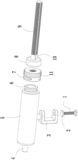 1.一种肝胆外科用腹水抽取装置,其特征在于,包括抽取器(5),所述抽取器(5)轴向一端设有向其轴向外侧延伸的针头安装部(4),其另一端设有盲孔形式的、且与针头安装部(4)连通的滑动槽,所述滑动槽内滑配卡合有活塞(8),所述活塞(8)上同轴设有穿出抽取器(5)的螺纹杆(10),所述滑动槽的槽口处设有制成内翻的环形凸出部,所述环形凸出部的内孔上设有多个卡块,所述螺纹杆(10)自由通过环形凸出部上的内孔,且其上设有供所述卡块卡合的、且供卡块沿螺纹杆(10)轴向自由滑动的条形槽(9),所述抽取器(5)上同轴转动连接有转动套(11),所述转动套(11)螺纹套装在螺纹杆(10)上,其转动时,驱动所述螺纹杆(10)沿抽取器(5)的轴向移动,进而使所述活塞(8)在滑动槽内滑动。