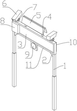 1.一种狭窄路段交通警示装置,其特征在于,包括两个支撑杆(1)、显示屏(3)、支架(4)、太阳能电池板(5)、两个摄像头(6)、稳压电源(8)、交通灯(9)、控制器(10)和安装框(11),所述显示屏(3)设置在所述安装框(11)的内部,所述显示屏(3)通过螺栓与所述安装框(11)连接,两个所述支撑杆(1)对称设置在所述安装框(11)下部的两侧,所述支撑杆(1)的上端通过螺栓与所述安装框(11)连接,两个所述摄像头(6)对称设置在所述安装框(11)的上部,所述摄像头(6)通过铰链(7)与所述安装框(11)连接,所述交通灯(9)设置在所述安装框(11)的下部的中心处,所述交通灯(9)通过螺栓与所述安装框(11)连接,所述支架(4)设置在所述安装框(11)的上部,所述太阳能电池板(5)、所述支架(4)和所述安装框(11)依次通过螺栓连接,所述稳压电源(8)通过螺栓与所述安装框(11)的左部连接,所述控制器(10)通过螺栓与所述安装框(11)的右部连接。