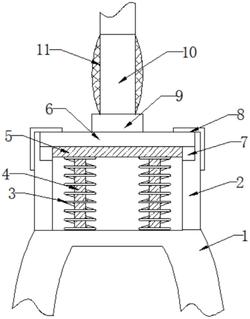 1.一种减震自行车前叉,包括双叉支撑杆(1),其特征在于:所述双叉支撑杆(1)顶部设有圆柱形室(2),所述双叉支撑杆(1)的上表面两端且位于圆柱形室(2)的内部设置有弹簧管(3),所述弹簧管(3)内部设置有橡胶立柱(4),所述弹簧管上端固定连接有吸震回弹块(5),所述吸震回弹块(5)为橡胶材质,所述吸震回弹块(5)的顶端设置有金属板(6),所述金属板(6)顶端设有连接栓(9),所述连接栓(9)上轴接竖杆(10),所述竖杆(10)的一圈包裹一层海绵胶套(11)。