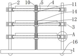 1.一种机械零部件摆放装置,其特征在于:包括底座、支撑柱、转动组件和圆形放置板,所述支撑柱设于底座顶部上,所述支撑柱设有四组且呈矩形分布,所述转动组件设于支撑柱上,所述圆形放置板设于转动组件上,所述转动组件包括转动盘、滑动箱、环形齿轮一、环形齿轮二和套筒,所述滑动箱两端分别滑动套接设于底座顶部一侧的两组支撑柱上,所述滑动箱设有两组且对称位于底座顶部两侧的两组支撑柱上,所述套筒转动设于滑动箱的内壁和底壁之间且位于滑动箱中部,所述底座顶部上设有螺丝杆,所述螺丝杆位于四组支撑柱之间,所述螺丝杆上通过外螺纹与内螺纹孔啮合套接设有螺纹筒,所述转动盘中心处设有圆口一,所述转动盘通过圆口一滑动穿过螺丝杆且转动盘底部与螺纹筒顶端滑动接触,所述环形齿轮一套接设于转动盘圆周上,所述滑动箱朝向环形齿轮一一侧侧壁设有开口一,所述转动盘和环形齿轮一穿过开口一伸入滑动箱内,所述环形齿轮二套接设于套筒上,所述环形齿轮一分别与两侧的环形齿轮二啮合,所述圆形放置板中心处设有圆口二,所述圆形放置板通过圆口二滑动穿过螺丝杆且圆形放置板底部设于转动盘顶部上。