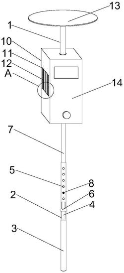 1.一种春香柑橘树枝高效率修剪设备,包括修剪设备本体(1),其特征在于:所述修剪设备本体(1)的底部设有滑杆(2),所述滑杆(2)的表面设有防滑橡胶(3)、滑口(4)和固定孔(5),所述滑杆(2)的内部设有连接杆(6)和固定杆(7),所述固定杆(7)的表面设有卡扣(8),所述固定杆(7)的内部设有回弹装置(9),所述固定杆(7)的顶部设有驱动装置(10),所述驱动装置(10)的侧面设有排气孔(11)和过滤网(12),所述驱动装置(10)的顶部设有切割刀片(13),所述驱动装置(10)的表面设有保护套(14)。