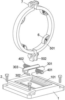 4.根据权利要求2所述的一种新能源汽车空调压缩机减震装置,其特征在于,所述第二减震组件(5)包括两个对称设置的套环(501),且两个所述套环(501)通过连接螺钉(7)连接固定,两个所述套环(501)的下端均固定连接有连接板(502),所述连接板(502)的外壁与滑动槽(303)内壁滑动配合,所述套环(501)的内壁上还开设有安装槽(503)。