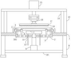 1.一种实木桌板表面平整刨削装置,包括有工作台(1),所述工作台(1)的台体上固定连接有固定架(13),所述固定架(13)的架体上安装有用于刨削加工的打磨片(18),其特征在于:所述工作台(1)的中部镶嵌有收纳框(2),所述收纳框(2)的上部端设有敞口结构,且所述收纳框(2)的两侧框壁上均转动连接有螺纹杆(5),所述螺纹杆(5)位于收纳框(2)内室的杆体上通过轴承转动连接有矩形板状的压板(6),所述工作台(1)的底部固定安装有液压推杆一(8),所述液压推杆一(8)的活塞杆端穿过收纳框(2)的底面延伸至内室并固定连接有水平设置的承载板(7),且所述收纳框(2)的框体内底部还开设有环形阵列分布的通孔(3),所述打磨片(18)的片体位于收纳框(2)敞口端的正上方。