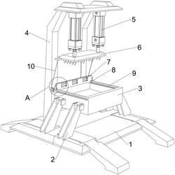 1.一种中草药加工用碾碎装置,其特征是,包括有底座(1)、支架(2)、放置框(3)、支撑架(4)、气缸(5)和碾碎板(6),所述底座(1)一侧边缘位置中间固接有支撑架(4),气缸(5)对称式的固接于朝向底座(1)的支撑架(4)内一侧,碾碎板(6)固接于两个气缸(5)的伸缩杆端部之间,支架(2)间隔固接于底座(1)一侧,支架(2)的数量为四个,放置框(3)固接于全部支架(2)内端之间,放置框(3)与碾碎板(6)对应。