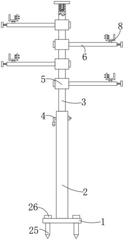 5.根据权利要求1所述的一种春香柑橘种植用枝条矫正支撑架,其特征在于:所述固定底座(1)的下端一体成型有用于将固定底座(1)固定在地面上的钉刺(25),且所述固定底座(1)的上表面设置有敲击块(26),所述敲击块(26)与的钉刺(25)对应设置。