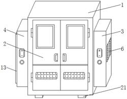 1.一种药品防潮存储装置,其特征在于,包括存储柜(1):所述存储柜(1)的正面通过销轴铰接有相对称的密封门(2),所述存储柜(1)的右侧面固定连接有除湿罩(3),所述存储柜(1)的左侧面固定连接有吸湿罩(4),所述除湿罩(3)的内侧壁固定连接有发热板(5),所述存储柜(1)的左右两侧面均开设有一组通风孔(7),所述存储柜(1)的内部设有等距离排列的载板(9),每个所述载板(9)的右侧面开设有除湿孔(10),两组所述通风孔(7)相互靠近的一端分别与一组除湿孔(10)的左右两端相连通,所述吸湿罩(4)的左侧面固定镶嵌有两个吸风扇(12)。2.根据权利要求1所述的一种药品防潮存储装置,其特征在于,每个所述载板(9)相互靠近的一侧面均开设有通孔(11),所述存储柜(1)的内部设有两个通风隔管(8),两个所述通风隔管(8)相互远离的一端分别与两组通孔(11)相互靠近的一端固定连通。3.根据权利要求2所述的一种药品防潮存储装置,其特征在于,所述存储柜(1)的内部设有两组隔板(14),两组所述隔板(14)的右侧面均开设有滑孔(15),两组所述滑孔(15)的内壁均滑动连接有滑板(16),两组所述滑板(16)相互靠近的一侧面分别与两个通风隔管(8)的左右两侧面固定连接。4.根据权利要求1所述的一种药品防潮存储装置,其特征在于,所述吸湿罩(4)的左侧面固定连接有防尘网(13),所述除湿罩(3)的右侧面固定镶嵌有通风格栅(6)。5.根据权利要求1所述的一种药品防潮存储装置,其特征在于,所述存储柜(1)的内底壁开设有凹孔(18),所述凹孔(18)的内底壁固定连接有吸湿盒(19),所述吸湿盒(19)的内部设有干燥剂包(20)。6.根据权利要求1所述的一种药品防潮存储装置,其特征在于,所述存储柜(1)的内顶壁固定连接有两个分类挡板(17),所述存储柜(1)的底面固定连接有两个支撑座(21)。