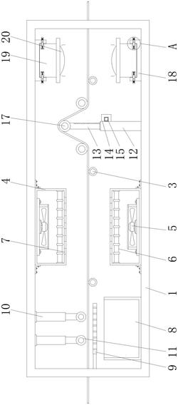 所述调节机构包括固定腔(12)、活动杆(13)、固定箱(14)、伺服电机(15)、传动齿轮(16)和调节辊(17),所述固定腔(12)安装于箱体(1)内部的底端,所述固定腔(12)的内部安装有活动杆(13),所述活动杆(13)的一端延伸至固定腔(12)的外部并安装有调节辊(17),所述固定腔(12)的一侧安装有固定箱(14),所述固定箱(14)的一端安装有伺服电机(15),所述固定箱(14)的内部安装有传动齿轮(16),所述传动齿轮(16)与活动杆(13)之间相互啮合。