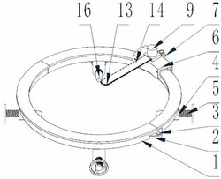1.一种自动树木砍伐机,包括套环(1)、滑动块(6)、移动轮(11)、锯链(13)、支撑臂(14)和固定锥头(16),其特征在于:所述套环(1)上连接有连接块(2),且套环(1)上安装有连接轴(3),并且套环(1)的下方安装有固定块(4),而且套环(1)的下方设置有螺纹杆(5),同时套环(1)上安装有固定销(15),同时套环(1)的上方安装有滑动块(6),同时套环(1)的上方安装有移动轮(11),所述连接块(2)上连接有连接轴(3),且连接块(2)上安装有固定销(15),所述固定块(4)上连接有螺纹杆(5),且固定块(4)的内部设置有固定锥头(16),所述螺纹杆(5)的内侧连接有固定锥头(16),所述滑动块(6)的下方安装有移动轮(11),且滑动块(6)的外侧安装有一号电动马达(7),并且滑动块(6)的外侧安装有三号电动马达(10),而且滑动块(6)的上方安装有转动座(8),所述一号电动马达(7)通过链条与转动座(8)连接,所述转动座(8)的上方安装有二号电动马达(9),且转动座(8)的内部安装有转动轮(12),并且转动座(8)的内部安装有锯链(13),而且转动座(8)的内部安装有支撑臂(14),所述二号电动马达(9)的下方连接有转动轮(12),所述三号电动马达(10)上连接有移动轮(11),所述转动轮(12)上连接有锯链(13),且转动轮(12)安装于支撑臂(14)上,所述支撑臂(14)上安装有锯链(13)。