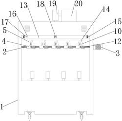 所述机架(1)内壁顶部左右两侧均固定有螺纹轴(16),所述螺纹轴(16)外部均螺纹连接有螺套(17),所述机架(1)内且位于螺套(17)下方设置有横管(13),所述螺纹轴(16)外侧设有固定于横管(13)与机架(1)内壁顶部之间的弹簧二(15),且所述横管(13)底部嵌入固定有若干根与其内部相通的插管(14)。