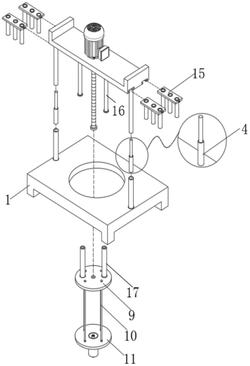1.一种水文地质用地下水采样装置,其特征在于,包括底座(1)、支撑板(6)、电机(7)、取样瓶(13)以及升降结构;所述支撑板(6)通过支撑杆(4)安装在所述底座(1)上方,所述电机(7)安装在所述支撑板(6)上,且所述电机(7)的输出轴面朝所述底座(1)设置,所述升降结构一端连接在所述电机(7)的输出轴上,另一端与所述取样瓶(13)可拆卸连接,所述底座(1)上设有供所述升降结构穿过的第一通孔(2);所述电机(7)能够驱动所述升降结构,使得所述取样瓶(13)朝着远离或者靠近所述支撑板(6)的方向移动。