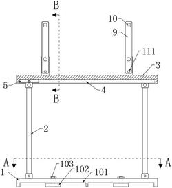 4.根据权利要求1所述的一种LED显示屏用支撑装置,其特征在于,所述支撑底座(1)的下侧开设有两个左右对称设置的收纳槽(101),收纳槽(101)内通过转轴转动安装有支撑板(102),转轴的上侧通过螺纹连接有拧紧螺帽(103)。