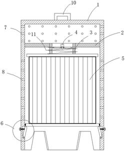 1.一种可方便更换滤网的空气净化器,其特征在于:包括净化器外壳(1),所述净化器外壳(1)的内腔设置有安装隔板(2),所述安装隔板(2)的中央设置有安装套筒(3),所述安装套筒(3)的内腔安装有轴流风机(4),所述安装隔板(2)的下方设置有圆筒滤芯(5),所述净化器外壳(1)侧壁位于圆筒滤芯(5)的下方设置有弹压扣锁机构(6)。2.根据权利要求1所述的一种可方便更换滤网的空气净化器,其特征在于:所述弹压扣锁机构(6)包括扣锁摆杆(61),所述扣锁摆杆(61)的下端通过销杆(62)转动嵌设安装与所述净化器外壳(1)的内壁,所述扣锁摆杆(61)的上端连接有拉绳(63),所述拉绳(63)的另一端贯穿至净化器外壳(1)外并连接有拉块(64),所述扣锁摆杆(61)与所述净化器外壳(1)的内壁之间抵接设置有第一压簧(65)。3.根据权利要求1所述的一种可方便更换滤网的空气净化器,其特征在于:所述净化器外壳(1)圆周外壁位于所述安装隔板(2)的上下两侧分别设置有阵列排布的出风孔(7)和进风孔(8)。4.根据权利要求1所述的一种可方便更换滤网的空气净化器,其特征在于:所述圆筒滤芯(5)的圆周为进风口、顶端中心为出风口,所述圆筒滤芯(5)的下端端板圆周嵌设安装有密封圈(9)。5.根据权利要求1所述的一种可方便更换滤网的空气净化器,其特征在于:所述净化器外壳(1)的顶端设置有提手(10)。6.根据权利要求1所述的一种可方便更换滤网的空气净化器,其特征在于:所述安装套筒(3)的外壁套设有第二压簧(11),所述第二压簧(11)上下两端与所述安装隔板(2)和圆筒滤芯(5)抵接。