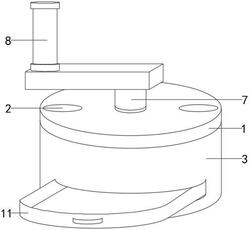 1.一种资源勘查便携式无源粉碎装置,包括:固定盘(1)、进料口(2)、本体(3)、第一粉碎刀(4)、转轮(5)、第二粉碎刀(6)、转轴(7)、手摇把(8)、托盘空腔(9)、出料口(10)、托盘(11)、空腔(301);其特征在于:所述固定盘(1)呈圆形板状;所述进料口(2)在固定盘(1)左右两侧开设有两个,且进料口(2)上下贯通固定盘(1);所述本体(3)设在固定盘(1)下端,且本体(3)与固定盘(1)螺栓固定;所述空腔(301)开设在本体(3)中间上端,且空腔(301)与进料口(2)相通;所述第一粉碎刀(4)在空腔(301)内壁设有多个,且第一粉碎刀(4)与空腔(301)内壁焊接固定;所述转轮(5)设在空腔(301)内部中间;所述第二粉碎刀(6)在转轮(5)外侧设有多个,且第二粉碎刀(6)与转轮(5)焊接固定;所述转轴(7)设在转轮(5)中间,且转轴(7)与转轮(5)键连接;所述手摇把(8)设在转轴(7)顶端,且手摇把(8)与转轴(7)螺栓固定;所述托盘空腔(9)开设在本体(3)前端下侧;所述出料口(10)在托盘空腔(9)上端左右两侧各开设有一个,且出料口(10)与空腔(301)相通;所述托盘(11)设在托盘空腔(9)内部,且托盘(11)与托盘空腔(9)滑动连接。