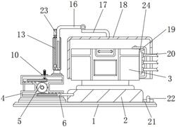1.一种光谱定量分析用多功能辅助装置,包括底板(1),其特征在于:所述底板(1)的顶部固接有方板(2),所述方板(2)的顶部固接有机体(3),所述底板(1)的顶部一侧固接有外壳(4),所述外壳(4)的内壁背面通过销轴转动相连有齿轮(5),所述齿轮(5)的上下两侧均啮合相连有齿条(6),两个所述齿条(6)的内壁均间隙配合有横杆(7),两个所述横杆(7)的外侧分别与外壳(4)的内壁两侧固定连接,上方所述齿条(6)的底部固接有竖杆(8),所述竖杆(8)的外壁与外壳(4)的一侧通孔间隙配合,下方所述齿条(6)的外壁一侧与外壳(4)的一侧通孔间隙配合,下方所述齿条(6)的外壁一侧与方板(2)的一侧凹槽间隙配合,上方所述齿条(6)的顶部凹槽间隙配合有圆杆(9),所述圆杆(9)的外壁与外壳(4)的顶部通孔间隙配合,所述圆杆(9)的外壁上方间隙配合有竖筒(10),所述竖筒(10)的底部通过螺栓与外壳(4)的顶部固定连接,所述圆杆(9)的外壁间隙配合有弹簧(11),所述弹簧(11)的两端分别与竖筒(10)的内壁顶部和圆杆(9)的下方固定连接,所述方板(2)的一侧固接有底座(21),所述底座(21)的通孔间隙配合有定位杆(22),所述定位杆(22)的底部与底板(1)的顶部固定连接,所述底座(21)的底部与底板(1)的顶部相贴合。2.根据权利要求1所述的一种光谱定量分析用多功能辅助装置,其特征在于:所述圆杆(9)的底部安装有圆轮。3.根据权利要求1所述的一种光谱定量分析用多功能辅助装置,其特征在于:所述圆杆(9)的顶部安装有把手。4.根据权利要求1所述的一种光谱定量分析用多功能辅助装置,其特征在于:所述外壳(4)的顶部固接有方壳(12),所述方壳(12)的顶部通过轴承转动相连有螺杆(13),所述螺杆(13)的顶部固接有马达(23),所述马达(23)的背面通过与方壳(12)的上方固定连接,所述螺杆(13)的外壁下方螺纹相连有套筒(14),所述套筒(14)的一侧固接有弯板(16),所述弯板(16)的底部凹槽间隙配合有竖板(15),所述竖板(15)的底部与方壳(12)的内壁底部固定连接,所述弯板(16)的外壁与方壳(12)的顶部通孔间隙配合,所述弯板(16)的一侧通过销轴转动相连有连杆(17),所述连杆(17)的一端固接有保护壳(18),所述保护壳(18)的内壁与机体(3)的外壁活动相连。5.根据权利要求1所述的一种光谱定量分析用多功能辅助装置,其特征在于:所述机体(3)的一侧连通有多个导线(20),多个所述导线(20)的外壁贯穿壳体(19),所述壳体(19)的一侧通过螺栓与机体(3)的外壁固定连接,多个所述导线(20)的外壁一侧与保护壳(18)的一侧凹槽活动相连,所述壳体(19)的内壁顶部安装有干燥箱(24)。