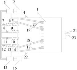 1.一种节能型纵焰玻璃熔窑,其特征在于,包括熔化池(1)、间壁换热器、助燃气源、燃料供给系统、燃烧喷枪和喷射热泵;熔化池(1)的一侧设有进料口,另一侧设有冷却室(21),冷却室(21)连接有成型装置(23),熔化池(1)中部设有横向间隔墙;横向间隔墙正对的胸墙上开设有若干火焰喷口,横向间隔墙上开设有与火焰喷口对应的烟气出口;火焰喷口和烟气出口均沿熔化池(1)纵轴线由最高级至最末级依次向两侧排布;最高级火焰喷口设置燃烧喷枪,其余火焰喷口均设置喷射热泵;上一级烟气出口通过烟道与下一级喷射热泵的第一进口连接,所有喷射热泵的第二进口连接有燃烧喷枪;最末级烟气出口与间壁换热器的热侧入口连通,助燃气源经间壁换热器的冷侧换热后分别与每个燃烧喷枪的助燃气进口连接,燃料供给系统分别与每个燃烧喷枪的燃料进口连接;烟气出口处设有导流板,烟气出口内侧设有引风机。