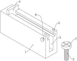 1.一种便携式螺丝钉,包括放置盒(1)和螺丝钉钉体(2),其特征在于:所述放置盒(1)的窄边一侧设置有凹槽(3),所述凹槽(3)滑动连接有滑块(4),所述放置盒(1)的顶部边缘设置有限位块(5),所述放置盒(1)的一侧顶部设置有卡扣(6),所述螺丝钉钉体(2)的顶部设置有螺帽(7),所述螺帽(7)的顶部设置有十字槽(701)。2.根据权利要求1所述的一种便携式螺丝钉,其特征在于:所述凹槽(3)的形状为T字形,所述凹槽(3)的尺寸大小与螺丝钉钉体(2)的尺寸大小相匹配。3.根据权利要求1所述的一种便携式螺丝钉,其特征在于:所述放置盒(1)的顶部设置有滑槽,所述放置盒(1)顶部滑槽与凹槽(3)内部相连通,所述滑块(4)通过放置盒(1)顶部滑槽与放置盒(1)滑动连接。4.根据权利要求1所述的一种便携式螺丝钉,其特征在于:所述滑块(4)为工字形,所述滑块(4)的尺寸大小与凹槽(3)的尺寸大小相匹配。5.根据权利要求1所述的一种便携式螺丝钉,其特征在于:所述卡扣(6)贯穿放置盒(1)至凹槽(3)内,所述卡扣(6)与放置盒(1)滑动连接,所述卡扣(6)的内端设置有橡胶头(601) ,所述卡扣(6)的外端设置有顶帽(602) ,所述卡扣(6)的内端外侧设置有限位板(603),所述放置盒(1)的内部设置有弹簧(8),所述弹簧(8)的一端与限位板(603)固定连接。6.根据权利要求1所述的一种便携式螺丝钉,其特征在于:所述十字槽(701)为倒三角形凹槽。