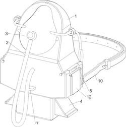 2.按照权利要求1所述的一种呼吸内科临床用药剂雾化喷药装置,其特征是:还包括有佩戴组件(10),佩戴组件(10)包括有:第一皮带(101),第一皮带(101)连接在外壳(1)下部一侧,第一皮带(101)上间隔均匀开有多个槽孔;第二皮带(102),第二皮带(102)连接在外壳(1)下部另一侧;卡扣(103),卡扣(103)连接在第二皮带(102)一侧,卡扣(103)与第一皮带(101)相互配合;挂绳(104),挂绳(104)对称连接在面罩(3)一侧中部;挂圈(105),挂绳(104)下部均连接有挂圈(105);挂钩(106),外壳(1)上部两侧均连接有挂钩(106),挂钩(106)与挂绳(104)相互配合。
