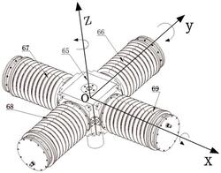 步骤2:建立浮力调节装置空间坐标系oxyz:以动力模块(65)的几何中心作为坐标原点O,以蜗杆(14)轴线作为z轴,以其中一个调节模块的中心轴线作为x轴,以垂直于x轴和z轴的轴线作为y轴;