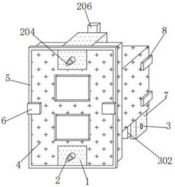 所述圆杆(301)的外壁与立板(7)的内壁转动相连,所述圆杆(301)的内壁与圆筒(302)的外侧焊接相连,所述圆筒(302)的内壁上下两侧分别与护圈(303)的外壁黏合相连。