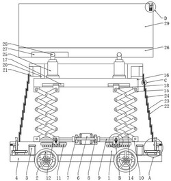 10.根据权利要求1所述的一种桥梁施工用便于移动的升降台,其特征在于:所述驱动轮(7)通过履带与传动轮(8)构成传动结构,且双向螺杆(9)通过传动轮(8)与固定块(10)转动连接,所述滑块(12)与双向螺杆(9)螺纹连接,且滑块(12)通过双向螺杆(9)与滑槽(11)滑动连接,所述连杆(14)之间转动连接,且滑块(12)通过连杆(14)与滑板(18)构成传动结构,所述滑板(18)与连杆(14)转动连接,且滑板(18)通过连杆(14)与滑轨(17)滑动连接。