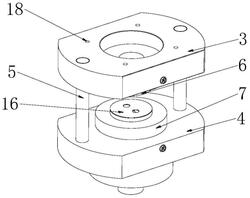 1.一种平面应变状态的断裂应变测试装置,其特征在于,该装置包括两平行设置的上模固定板和下模固定板,上模固定板利用通孔与成形试验机螺栓连接,上模固定板与下模固定板之间设置有至少两个导柱,导柱与下模固定板滑动配合;上模固定板靠近下模固定板的中心处设置有凹模,下模固定板靠近上模固定板的一侧处设置有压边圈,凹模与压边圈相配合;压边圈上侧面处设置有平面应变状态的拉伸试样;下模固定板上设置有冲头机构,冲头机构与成形试验机连接;其中,冲头机构包括双动冲头一、双动冲头二和二面体冲头,压边圈中心位置处设置有压边圈中心孔,下模固定板的中心位置处开设有下模中心孔,双动冲头二的底部中心位置开设有双动冲头中心螺纹孔,下模中心孔上侧与压边圈卡接配合,下模中心孔下侧与双动冲头一卡接配合,双动冲头一的中心位置设置有冲头中心孔,双动冲头二和二面体冲头设置在冲头中心孔内,双动冲头中心螺纹孔与成形试验机螺栓配合,二面体冲头的冲头端位于拉伸试样的下侧面处,二面体冲头的基体端与双动冲头二相连接。