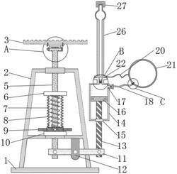 1.一种防止河流水流速度过快的监测报警装置,包括底座(1),其特征在于:所述底座(1)的上方固定安装有支架(2),所述支架(2)的上方铰接安装有阻流板(3),所述阻流板(3)的下方固定安装有铰接座(4),所述铰接座(4)的下方滑动安装有主轴(5),所述主轴(5)的中间固定安装有上挡板(6),所述上挡板(6)的下方固定安装有保护套(7),所述保护套(7)的内部固定安装有弹簧体(8),所述弹簧体(8)的下方转动安装有调节转轮(9),所述调节转轮(9)的下方固定安装有下挡板(10),所述主轴(5)的下方转动安装有连接杆(11),所述连接杆(11)的中间位置固定安装有固定座(12),所述连接杆(11)的右端转动安装有塞杆(13),所述塞杆(13)的上方固定安装有气塞(16),所述气塞(16)滑动安装在气筒(14)的内部,所述气筒(14)的下端固定安装有密封圈(15),所述气筒(14)的右端上方开有出气口(17),所述出气口(17)的右端固定安装有充气管(18),所述充气管(18)的右端固定安装有气针(19),所述气针(19)的右端固定安装有漂浮球(21),所述气筒(14)的上方滑动安装有活动环(22),所述活动环(22)上固定安装有柔性绳(20),所述气筒(14)的上端面上开有入气口(25),所述入气口(25)的内部固定安装有阀体(24),所述阀体(24)的下方滑动安装有活塞(23),所述入气口(25)的上方固定安装有入气管(26),所述入气管(26)的上方固定安装有防护罩(27);所述铰接座(4)通过螺钉固定安装在阻流板(3)的下端面,主轴(5)的上端通过螺栓与螺母铰接安装在铰接座(4)上;所述上挡板(6)固定安装在主轴(5)上,弹簧体(8)的上端安装在上挡板(6)的下端面;所述出气口(17)的内部固定安装有单向气阀;所述气针(19)与漂浮球(21)的结合处固定安装有气嘴;所述活塞(23)与阀体(24)下端之间固定安装有小弹簧,阀体(24)的下端面上开有小孔。