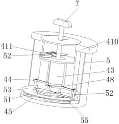 1.一种货车防盗油箱,包括带有出油管的箱体(2)、钥匙(7)、桶体(5)、锁体(4)和锁盖(3),所述桶体(5)设置于出油管上,所述锁盖(3)可拆卸地安装在出油管上,其特征在于:所述桶体(5)内设置有闭合机构,用于打开或闭合桶体(5),所述闭合机构包括旋转板(53)、若干个扇形板(51)和若干个圆弧板(55),所述扇形板(51)一侧与桶体(5)底部铰接,另一侧与圆弧板(55)的一端铰接,圆弧板(55)的另一端与旋转板(53)的底部铰接,所述旋转板(53)顶部设置有卡柱(52);所述锁体(4)可拆卸的安装于桶体(5)内;所述锁体(4)包括壳体(410)、锁芯(420)和卡爪机构,所述锁芯(420)安装于壳体(410)内部,卡爪机构设置于锁芯(420)的底部,所述卡爪机构与卡柱(52)相互配合,用于旋转旋转板(53)从而打开或关闭桶体(5),所述锁芯(420)内部设置有复位机构和锁紧机构,所述复位机构与卡爪机构相连用于对卡爪机构的复位,所述锁紧机构用于将锁体(4)固定在桶体(5)上;