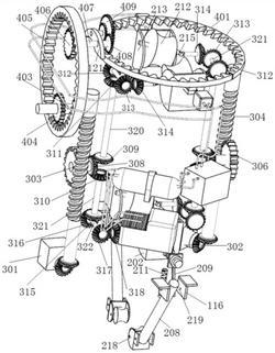 1.一种螺旋升降设备,其特征在于:包括两个主轮组件一(201)、两个主轮组件二(202)、用于调节两个主轮组件一(201)间距的调节件一、用于调节两个主轮组件二间距的调节件二、传动组件一(303)、传动组件二(304)、电机一(301)、电机二(302)和转向齿环(401);所述传动组件一(303)和传动组件二(304)均包括蜗杆(305)和与蜗杆(305)相啮合的蜗轮(306);所述蜗轮(306)通过传动单元一带动主轮组件一(201)和主轮组件二(202)运动;所述转向齿环(401)通过传动单元二与传动组件一(303)中的蜗杆(305)啮合相连;