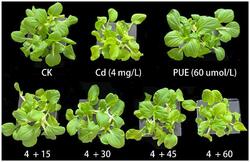 3.一种缓解植物镉胁迫和/或提高植物产量的方法,其特征在于,包括:将葛根素溶液施用于植物;所述葛根素溶液的浓度为15~30μmol/L;所述缓解植物镉胁迫包括:降低镉胁迫下植物根系的镉吸收,降低镉胁迫下植物丙二醛含量,降低镉胁迫下植物过氧化氢含量,降低镉胁迫下植物脯氨酸含量,提高镉胁迫下植物的根重与鲜重,提高镉胁迫下植物总叶绿素含量,提高镉胁迫下植物超氧化物歧化酶、抗坏血酸过氧化物酶、过氧化氢酶和愈创木酚过氧化物酶的酶活性,和提高镉胁迫下植物可溶性蛋白与VC含量中的一种或多种。
