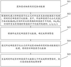 6.如权利要求5所述的滚动轴承故障监测装置,其特征在于,在所述历史数据处理模块和所述实时数据处理模块中,所述峰值因子比公式,具体为:其中,x1为第一参数,x2为第二参数,x3为第三参数,H(x1,x2,x3)为t时刻的峰值因子比,F1(x1)为振动数据t到t1时刻包含的x1个采样周期的峰值因子平均值,F2(x2,x3)为振动数据从t时刻偏移x2个采样周期到t2时刻后,t2到t3时刻包含的x3个采样周期的峰值因子平均值,x1+n≤x2,n≥1,x1≤x3。