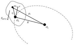 将立方体卫星视为由两个部分组成的系统,其一是卫星壳体,其质心在立方体的体心Ob处,拥有系统90%以上的质量;其二是由壳体内部的可动质量块组成的质点系,各个质量块相对于壳体质心的相对位矢为ri;可动质量块均能视为质点,其质量用mi表示;卫星壳体质心相对地心Oe位矢为R,质量块相对地心位矢为ρi;Faero表示作用于卫星上的气动阻力,与卫星运行速度方向矢量v反向;