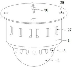 1.一种用于楼宇的智能消防报警装置,其特征在于,包括固定壳(1)和透明转动罩(2),所述透明转动罩(2)活动插接在固定壳(1)的底部,所述透明转动罩(2)的外边侧固定镶嵌有动态报警装置(3),所述动态报警装置(3)包括动态反射镜(4)和固定座(5),所述固定座(5)上开设有中型伸缩孔(6),所述中型伸缩孔(6)内活动安装有活动座(8),所述活动座(8)的一侧固定安装有透明报警罩(9),所述中型伸缩孔(6)开口端的内边侧固定安装有清理垫(10),所述固定壳(1)内固定安装有环形单面反射镜(13),所述环形单面反射镜(13)的底部固定安装有U型单面发射镜(16),所述固定壳(1)顶部的内侧壁上固定安装有电动机(17),所述电动机(17)的输出轴上固定安装有连接装置(18),所述透明转动罩(2)的内侧壁上固定安装有若干个弧形透明折射座(12),所述活动座(8)的另一侧与中型伸缩孔(6)一侧的内侧壁之间固定连接有拉簧(7),所述活动座(8)上开设有透光孔(11),所述固定壳(1)的顶部连接有电源线(30),所述固定壳(1)顶部的内侧壁上固定安装有烟雾传感器(28),所述环形单面反射镜(13)上开设有直射孔(14),所述固定壳(1)顶部的内侧壁上与直射孔(14)对应的位置处固定安装有报警灯(15),所述电源线(30)分别与报警灯(15)、电动机(17)和烟雾传感器(28)电性连接。
