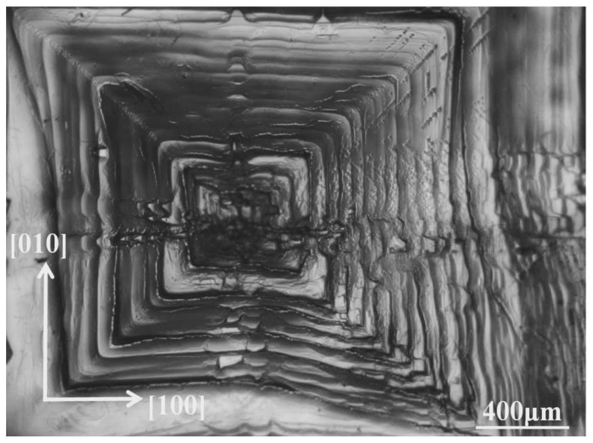 (4)用偏光显微镜筛选形状规则、光学均匀性良好的微小单晶作为籽晶,放入上述平底烧杯中,随后盖上平底烧杯顶部的密封盖,用保鲜膜进行二次密封,并用橡皮筋加固;