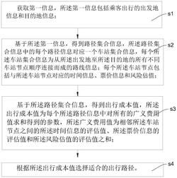 基于所述路径集合信息,得到出行成本值,所述出行成本值为每个所述路径信息中对所有的广义费用值求和得到的参数,所述广义费用值为相邻所述车站节点之间的所述时间信息的评估值、所述票价信息的评估值和所述风险估值的评估值之和;