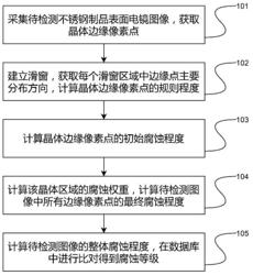 1.一种不锈钢制品表面质量检测方法,其特征在于,包括:采集待检测不锈钢制品表面电镜图像,对所述待检测图像进行分割得到多个晶体区域,获取每个晶体区域的所有边缘像素点以及对应晶体区域的面积;以每个晶体区域的边缘像素点为中心建立滑窗,获取每个滑窗区域中灰度值较大像素点的主成分方向作为该滑窗的边缘点主要分布方向,根据该滑窗中心点与该滑窗内各个像素点的连接方向与所述主要分布方向的夹角余弦值计算每个边缘像素点的规则程度;根据每个边缘像素点的规则程度计算该边缘像素点的初始腐蚀程度,根据每个晶体区域所有边缘像素点的初始腐蚀程度均值与该晶体区域的面积计算该晶体区域的腐蚀权重;根据每个晶体区域的腐蚀权重和该晶体区域每个边缘像素点的初始腐蚀程度计算该晶体区域中每个边缘像素点的最终腐蚀程度;根据待检测图像中所有边缘像素点的最终腐蚀程度计算该待检测图像的整体腐蚀程度,根据所述待检测图像的整体腐蚀程度在数据库中进行比对,得到待检测不锈钢制品的腐蚀等级。2.根据权利要求1所述的一种不锈钢制品表面质量检测方法,其特征在于,计算每个边缘像素点的规则程度的方法为:对待检测塑料制品表面电镜图像进行自适应阈值分割,得到待检测塑料制品表面二值图,以二值图中每个边缘像素点为中心建立滑窗,对每个滑窗区域中所有像素点进行主成分分析,获取灰度值较大的像素点的主成分方向作为该边缘像素点的主要分布方向;计算每个边缘像素点的规则程度的表达式为:其中Gi表示第i个边缘像素点的规则程度,Hi为第i个边缘像素点的灰度值,(xj ,yi) ,(xj,yj)表示第i个边缘像素点的坐标和该滑窗内第j个像素点的坐标,表示第i个边缘像