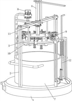 固定柱(1100),所述支撑架(2)的两侧均固接有至少两根固定柱(1100);转环(1101),每个固定柱(1100)上均转动式连接有转环(1101);卡杆(1102),每个转环(1101)上均连接有卡杆(1102),所述卡杆(1102)和所述转盘(5)接触。7.如权利要求6所述的一种生物医药植物药根部旋转清洗设备,其特征在于,还包括有下压机构(12),下压机构(12)包括有:第三固定架(1200),所述底板(1)顶部远离所述第一固定架(80)的一侧固接有第三固定架(1200);下压杆(1201),所述下压杆(1201)滑动式设置在所述第三固定架(1200)上;第三弹簧(1202),所述下压杆(1201)上设置有第三弹簧(1202),所述第三弹簧(1202)的两端分别与所述第三固定架(1200)和所述下压杆(1201)连接;棘条(1203),所述棘条(1203)滑动式设置在所述下压杆(1201)上;第四弹簧(1204),所述棘条(1203)上设置有第四弹簧(1204),所述第四弹簧(1204)的两端分别与所述下压杆(1201)和所述棘条(1203)连接;棘齿轮(1205),所述棘齿轮(1205)安装于所述球阀(71)上,所述棘齿轮(1205)和所述棘条(1203)配合。8.如权利要求1所述的一种生物医药植物药根部旋转清洗设备,其特征在于,所述转盘(5)的外侧均匀间隔的开有用于放置植物的放置槽。