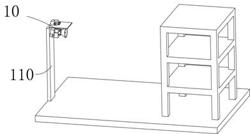 监测机构,建筑物的一侧竖直设置有支撑板,支撑板的顶部水平设置有安装板,监测机构包括安装壳体一、安装壳体二、电机一、照明灯,所述的安装壳体一固定设置于支撑板的壁部并且靠近支撑板的顶部,所述的安装壳体二与安装壳体一之间转动连接,所述的电机一安装于安装壳体一的壁部,电机一的输出轴呈水平布置,电机一的输出轴与安装壳体二的壁部之间固定连接,所述的照明灯安装于安装壳体二上,照明灯上匹配设置有灯罩,照明灯的一侧设置有摄像头,安装壳体二上设置有推移组件,推移组件包括电机二、丝杆、导套一、导柱、导套二,所述的电机二安装于安装壳体二上,电机二的输出轴呈水平布置并且与电机一的输出轴垂直,所述的丝杆的一端与电机二的输出轴同轴固定连接、另一端水平延伸,导柱平行设置于丝杆的一侧,所述的导套一、导套二的设置于灯罩的底部,丝杆匹配套设于导套一内,导柱匹配套设于导套二内;安装板上设置有清理机构,清理机构包括传动组件一、触发组件、传动组件二,所述的传动组件一包括进风壳体、拨轮、连接轴一、限位块、套环,进风壳体设置于安装板上,进风壳体的两端部分别接通有进风管、排风管,拨轮匹配转动设置于进风壳体内,拨轮的中心轴呈竖直布置,连接轴一竖直设置于拨轮的中心轴底部,限位块固定设置于连接轴一的底部边沿,限位块设置有若干个并且均匀环绕于连接轴一的圆周方向,所述的套环活动套设于连接轴一上,套环的底部设置有外花键,外花键设置有若干个并且均匀环绕于套环的圆环边沿,连接轴一上套设于弹簧一,弹簧一的一端与套环的底部接触、另一端与限位块接触;传动组件二包括连接轴二、转盘、导向杆、推板、敲击杆,安装板的底部设置有连接板,连接轴二的底部穿过连接板的板面,连接轴二呈竖直布置并且处于连接轴一的正下方,连接轴二的顶部靠近连接轴一的底部,连接轴二的上段圆周上开设有与外花键匹配的键槽,转盘同轴固定连接于连接轴二的底部,安装壳体一的顶部竖直设置有支撑板、敲击板,导向杆的一端与支撑板的板面固定连接、另一端设置有外置台阶,导向杆设置有两个并且呈平行布置,导向杆呈水平布置,推板套设于导向杆上,导向杆上套设有弹簧二,弹簧二的一端与支撑板接触、另一端与导向杆的外置台阶接触,敲击杆水平固定连接于推板的板面上,敲击杆与导向杆平行,敲击杆的端部靠近敲击板,转盘的圆周上设置有凸块,凸块设置有若干个并且均匀环绕于转盘的圆周方向,凸块为弧形凸块,转盘的圆周面与推板的板面接触;