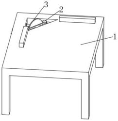 所述放置桌(1)包括桌板(11),所述桌板(11)的上表面靠近两邻边的位置固定连接有两个垂直放置的挡板条(13),两个所述挡板条(13)之间的桌板(11)上开始有切割洞(12),所述挡板条(13)对应的桌板(11)的侧壁上开设有滑动腔(14);