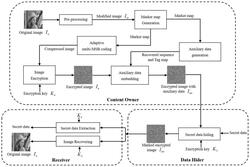 位置图L的生成方法为:每个块用一个二进制位来标记,若是平滑块用“1”来标记,若是粗糙块则用“0”来标记,生成公式为:步骤4、采用自适应编码将步骤3中的平滑块与粗糙块中的像素分别压缩,生成必要的辅助数据:哈夫曼编码规则、参考像素、恢复序列Rq、标签图;同时利用加密密钥伪随机生成一个二进制矩阵S,将二进制矩阵S与步骤1产生的修正图像Im进行位异或,生成加密图像Ie;