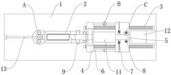 1.一种全自动金属管切割机床,包括台板(1),其特征在于,所述台板(1)上沿平分线方向依次安装有送料机构(2)和两个滑轨(3),两个所述滑轨(3)上共同滑动安装有第一支架(31)和第二支架(32),所述第一支架(31)和第二支架(32)上分别安装有切割机构(4)和定位机构(5),所述切割机构(4)包括固定在第一支架(31)上的切割盘(41),所述定位机构(5)包括固定在第二支架(32)上的定位盘(51),所述切割盘(41)居中贯穿开设有第一料口(42),所述定位盘(51)上居中贯穿开设有第二料口(52),第二料口(52)的直径大于第一料口(42),所述切割盘(41)和定位盘(51)之间共同安装有多个液压调距机构(6),所述送料机构(2)上安装有旋转驱动机构(9),所述定位盘(51)内分别嵌设安装有多个锁定机构(7)和多个检测机构(8);